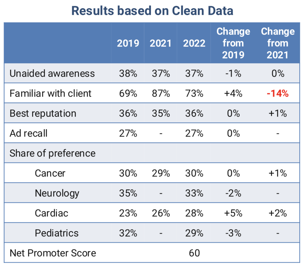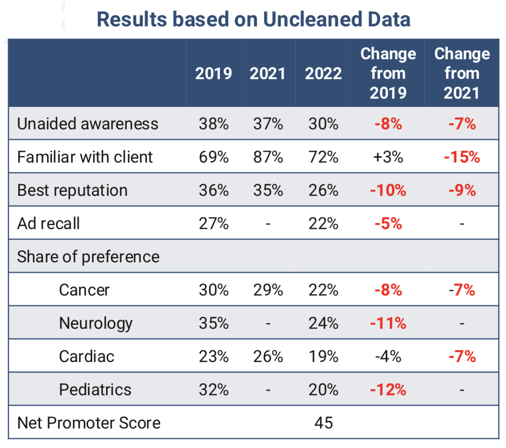 The results based on the uncleaned data didn’t look pretty. Our client was losing significant ground throughout the consumer journey, with lower top-of-mind awareness, lower levels of consumer familiarity, and lower advertising recall. They were less likely to be seen as having the best reputation for serious or complex care, compared to prior years, and fewer people preferred them for their key service lines. And their net promoter score suggested a possible patient experience challenge as well.